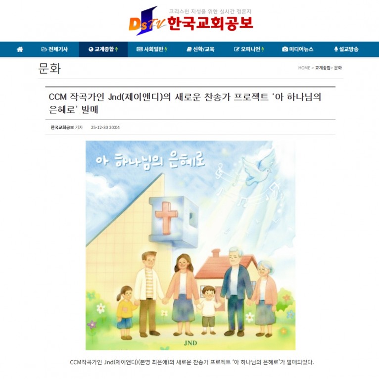 [기사] CCM 작곡가인 Jnd(제이앤디)의 새로운 찬송가 프로젝트 ‘아 하나님의 은혜로’ 발매(한국교회공보)