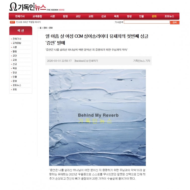 [기사] 열 아홉 살 여성 CCM 싱어송라이터 유채희의 첫번째 싱글 ‘증언’ 발매(기독인뉴스)