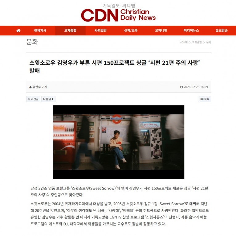 뮤직타임 [기사] 스윗소로우 김영우가 부른 시편 150프로젝트 싱글 ‘시편 21편 주의 사랑’ 발매(기독일보 씨디엔)